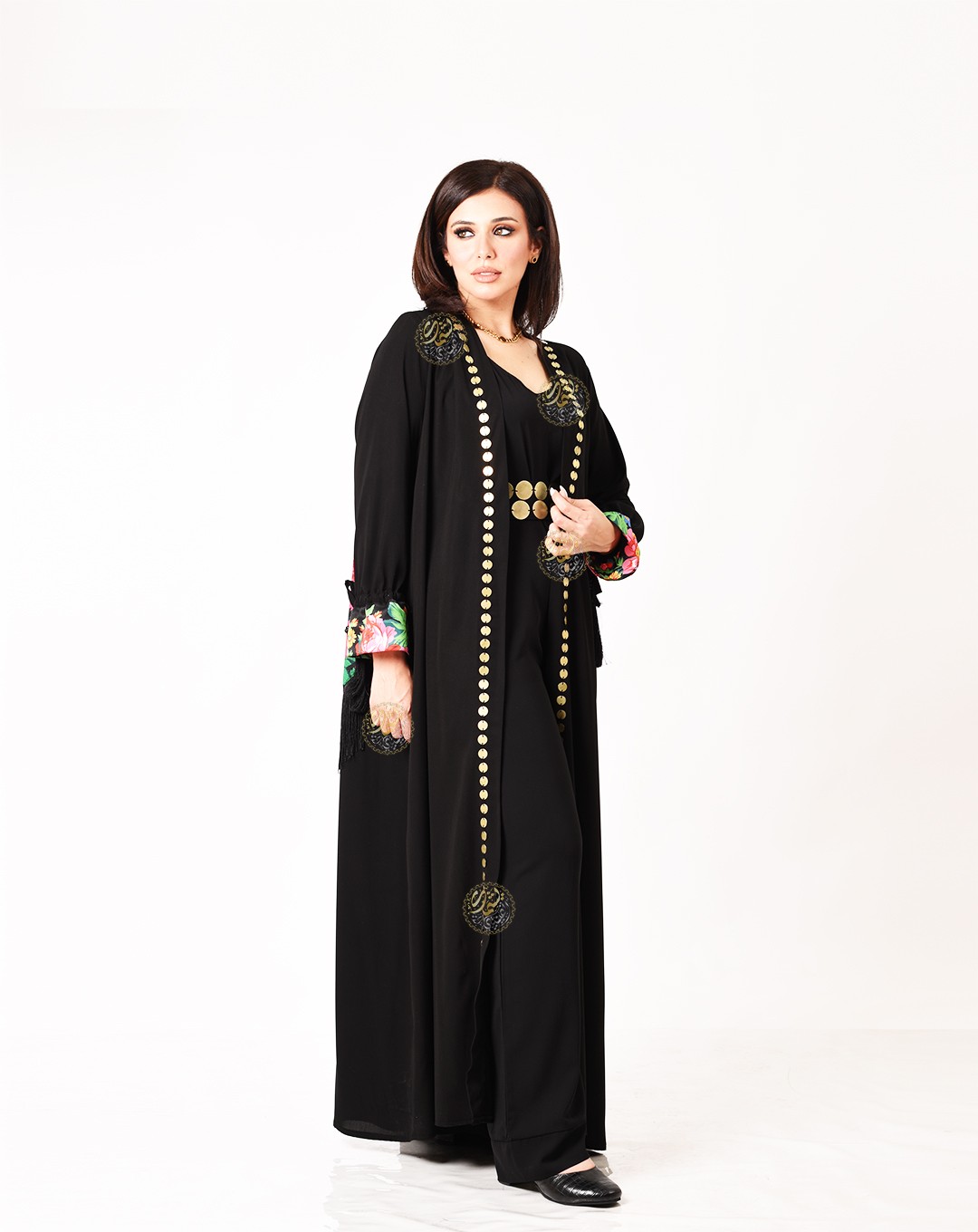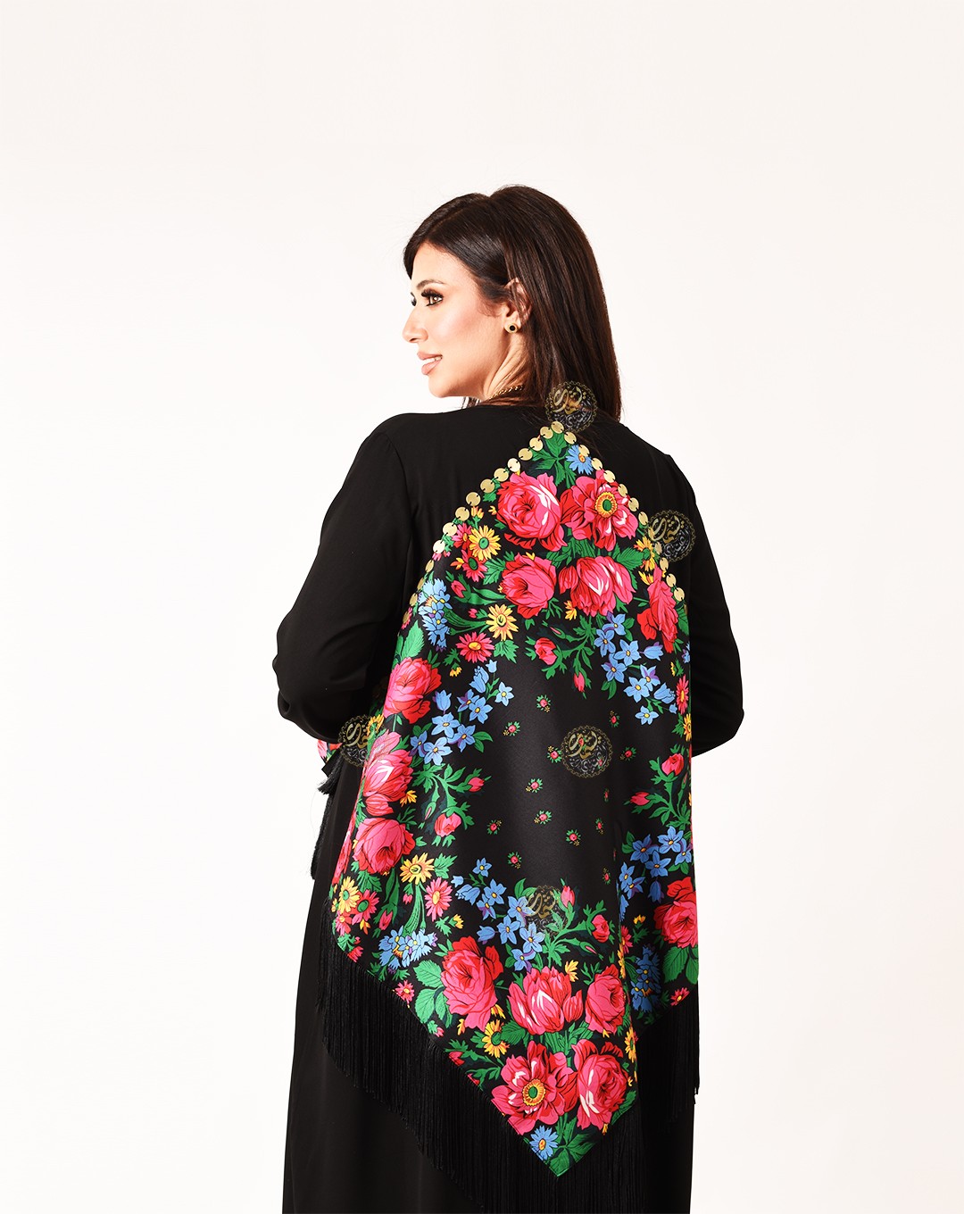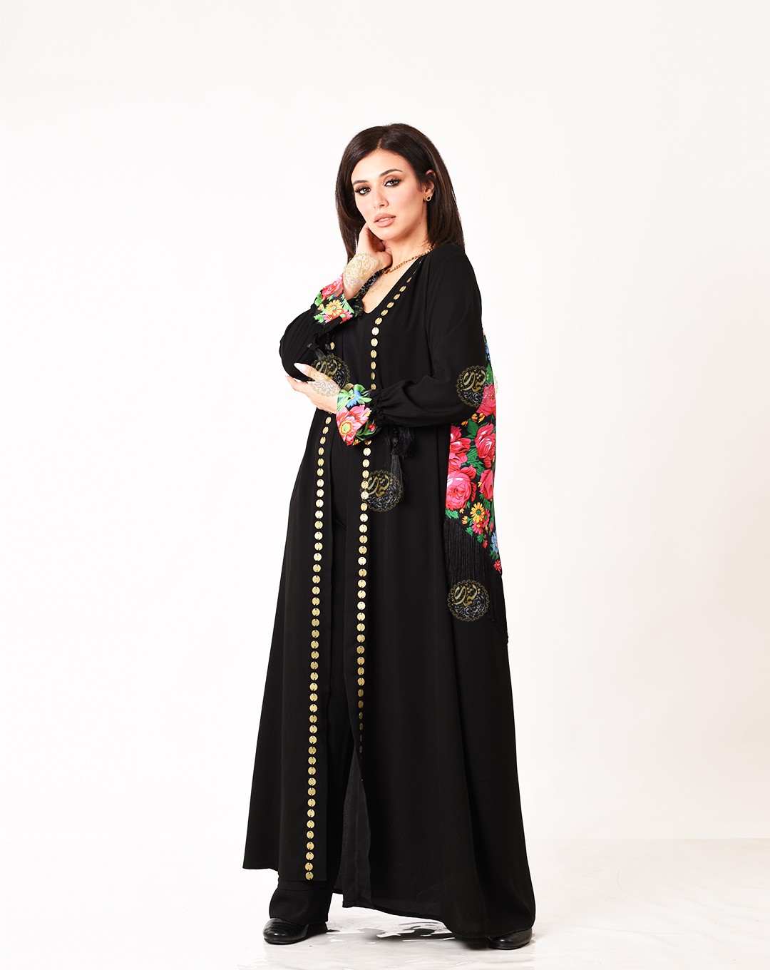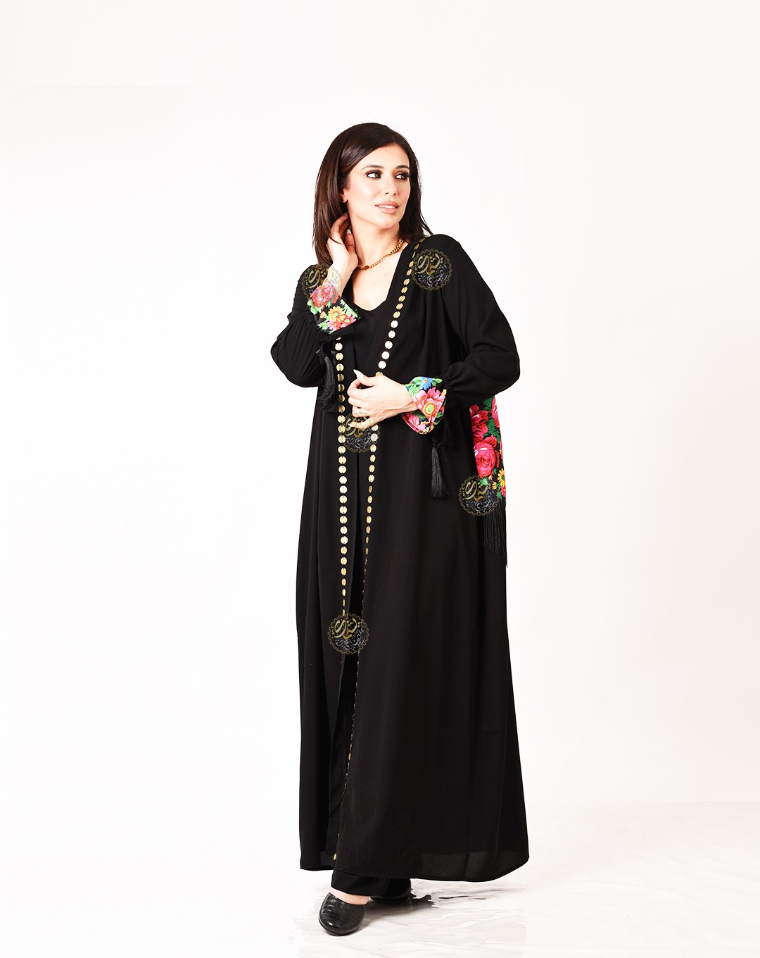An ideal design for daily outings, made from royal crepe with pink scarves, silk tassels, and hand-embroidered with brass coins. Available in all sizes.
