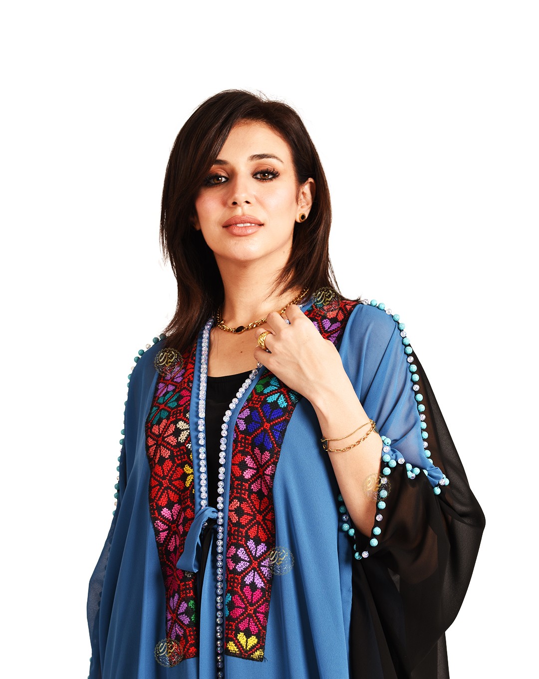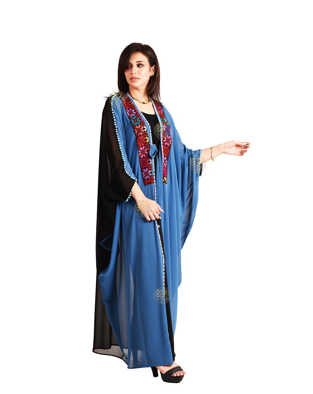 One of the most important and beautiful designs, this very elegant caftan is inspired by authentic Bedouin style. Made from luxurious royal Chiffon fabric with hand-embroidered etamin, and embellished with copper coins and colorful Bedouin beads. Available in a one-size fits all.