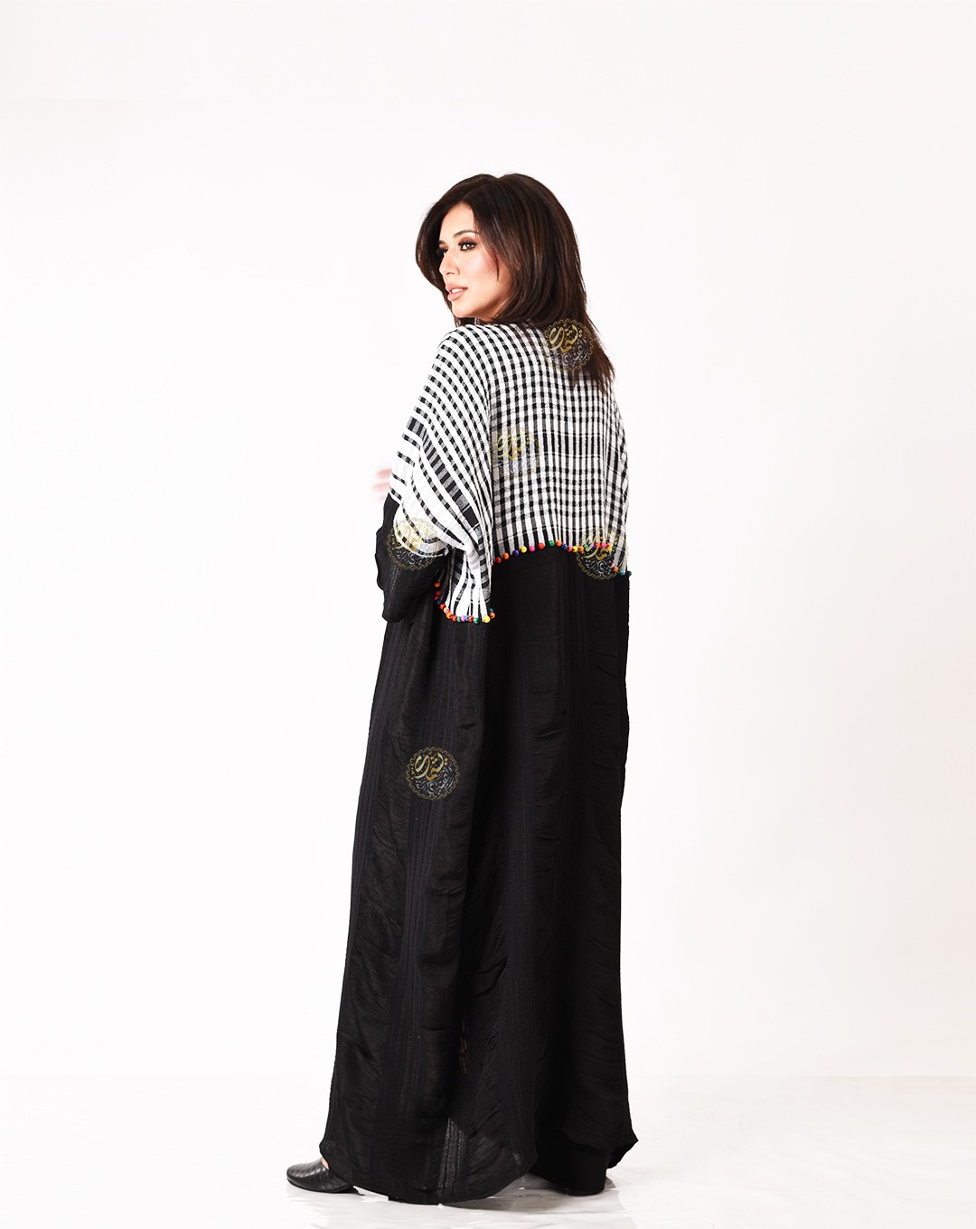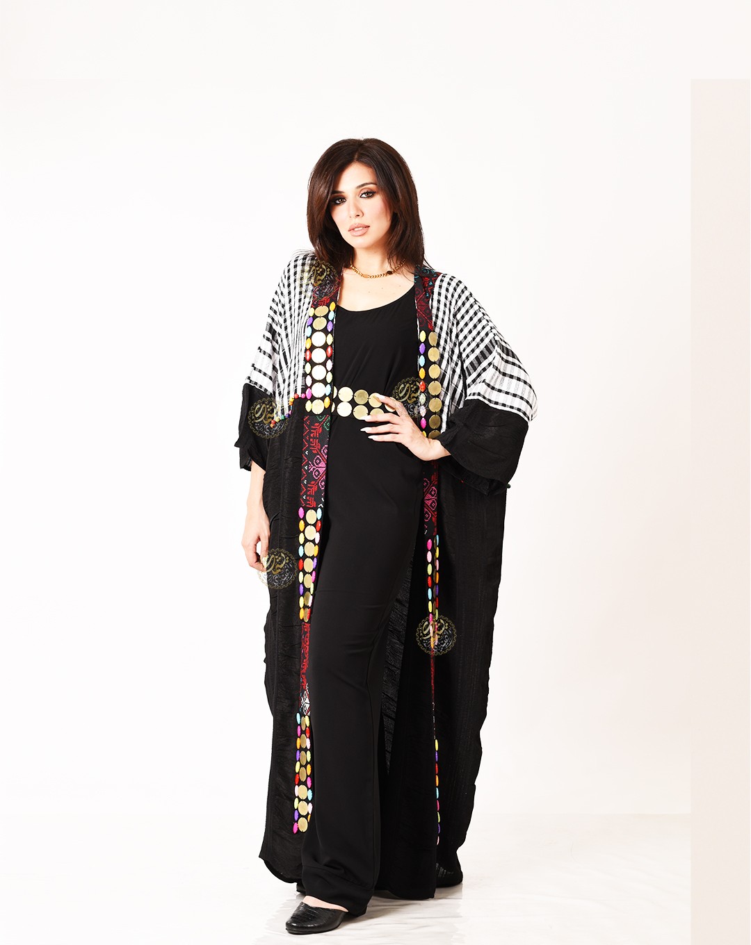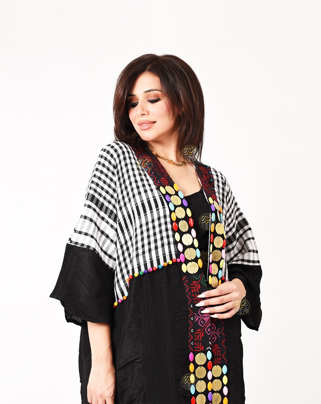 A very elegant design, made from luxurious Saidi malas with the Palestinian keffiyeh, and hand-embroidered with brass coins and colorful beads. Available in one size (Free Size) to fit all body types.