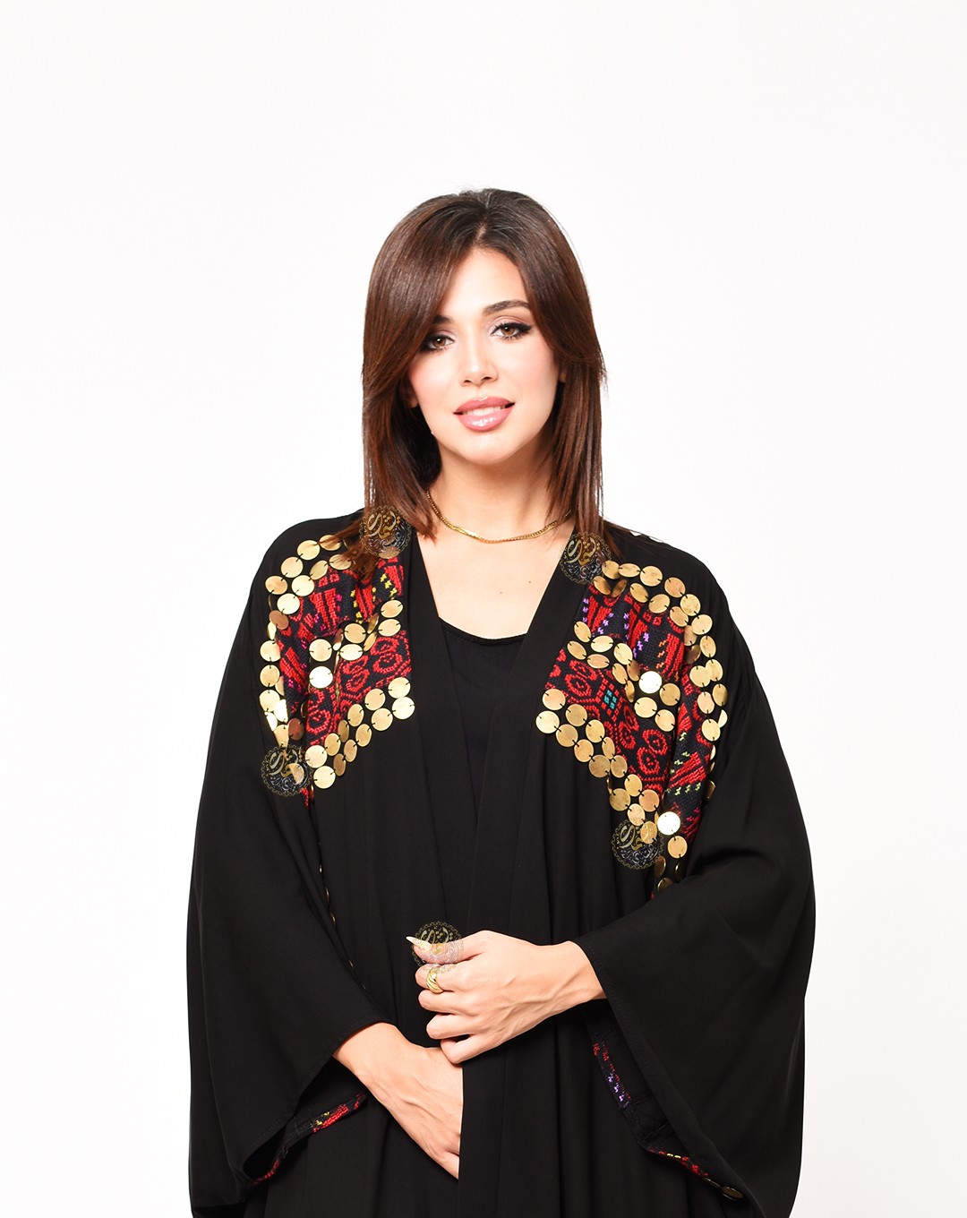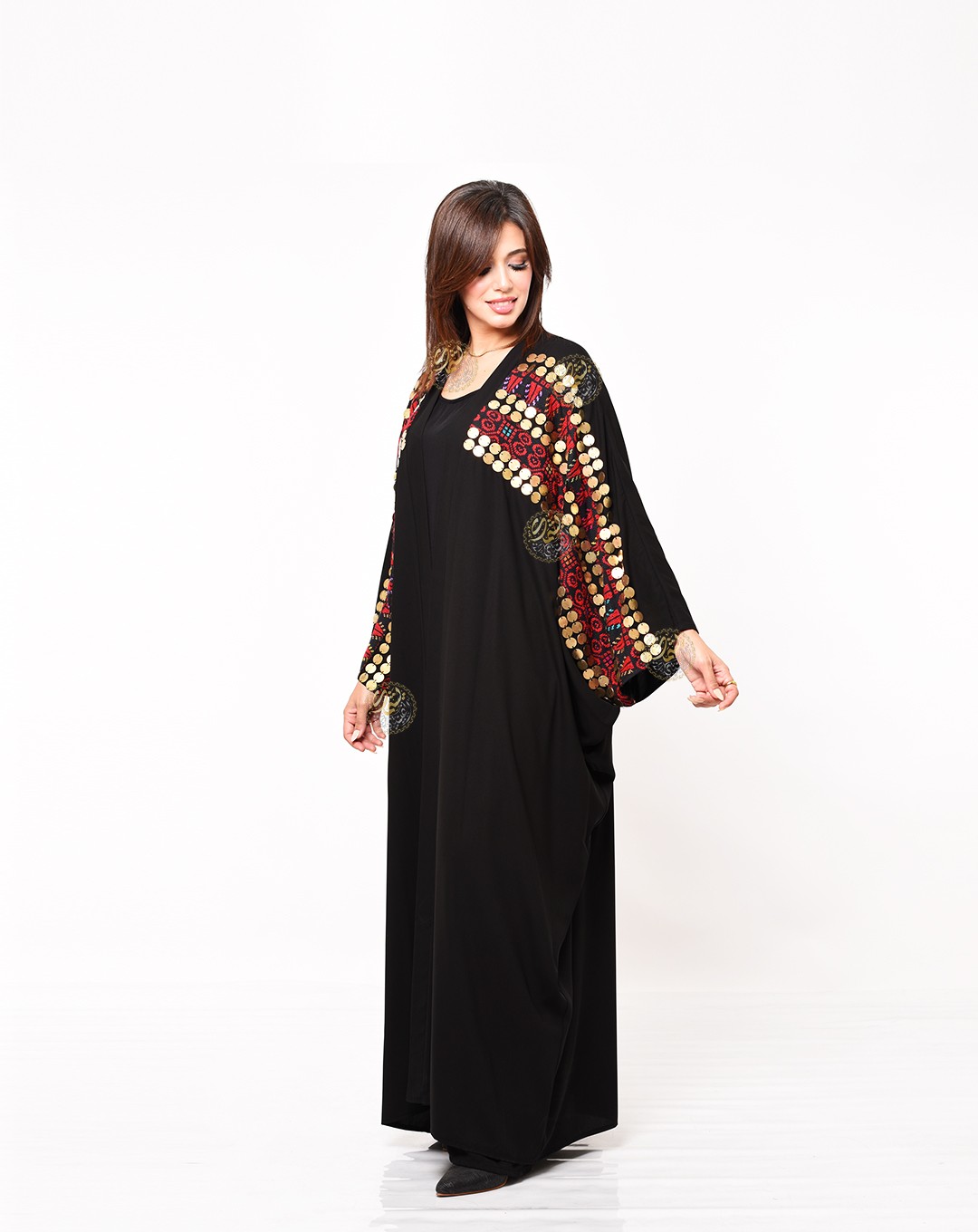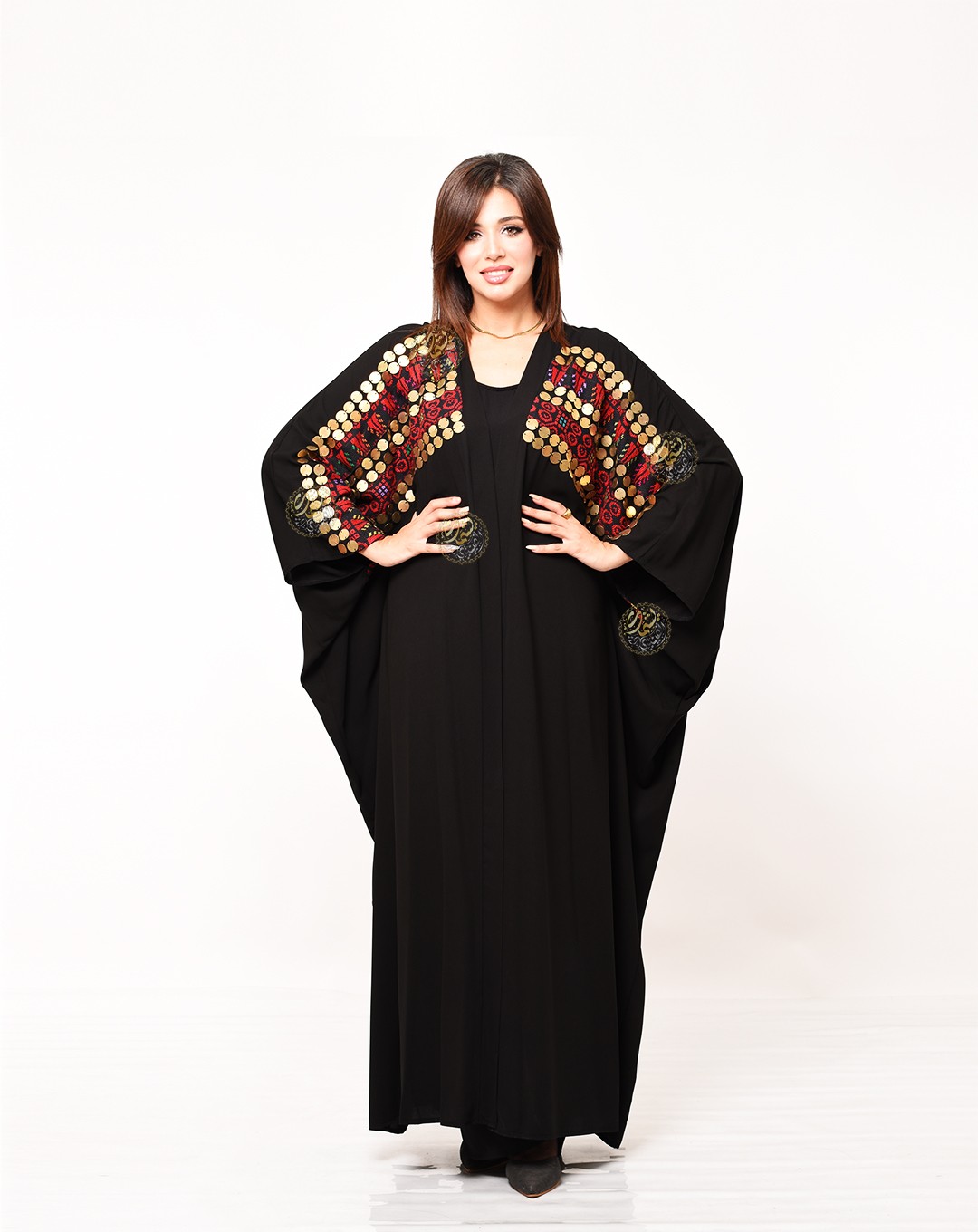 One of the most important and beautiful designs, this very elegant caftan is inspired by authentic Bedouin style. Made from luxurious royal crepe fabric with hand-embroidered etamin, and embellished with copper coins and colorful Bedouin beads. Available in a one-size fits all.