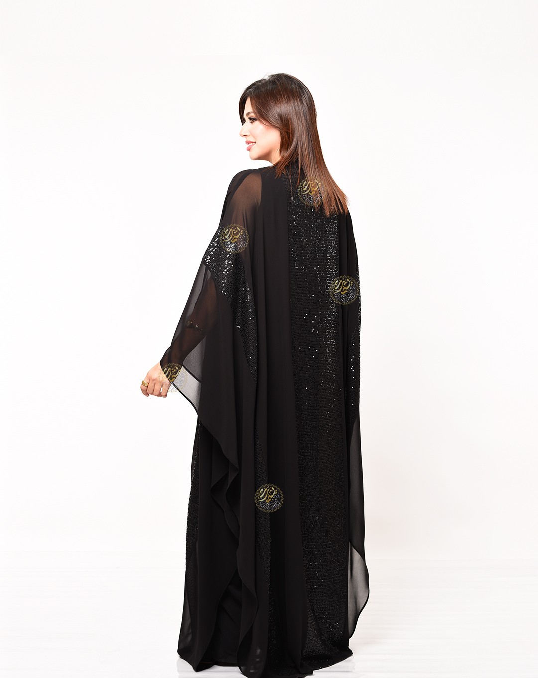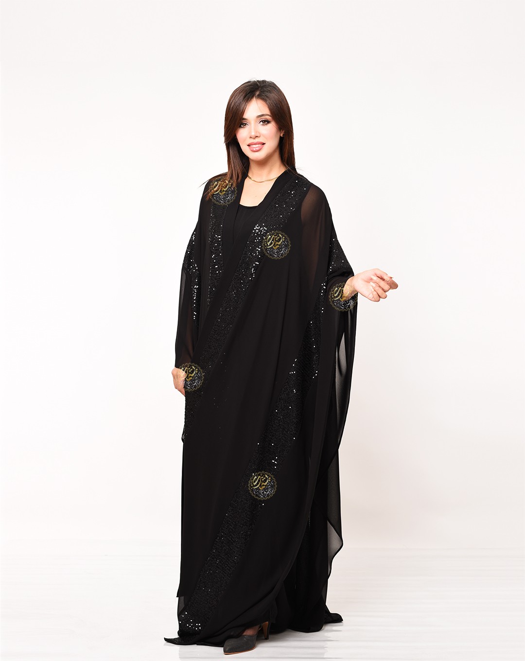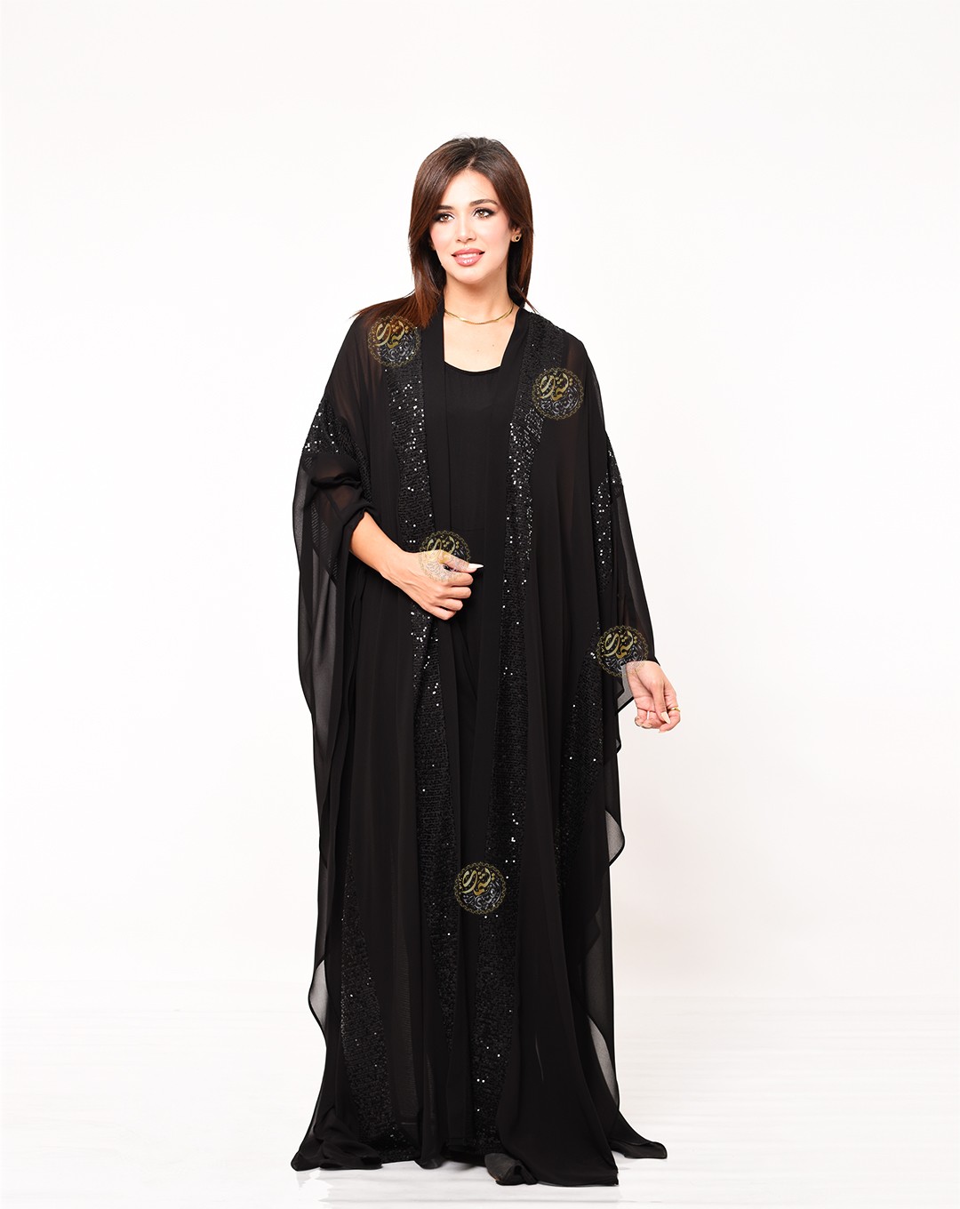An elegant soirée caftan, perfect for joyful evening events, made from luxurious chiffon fabric with distinctive black sequins. A design that blends simplicity and sophistication, available in a one-size fits all.