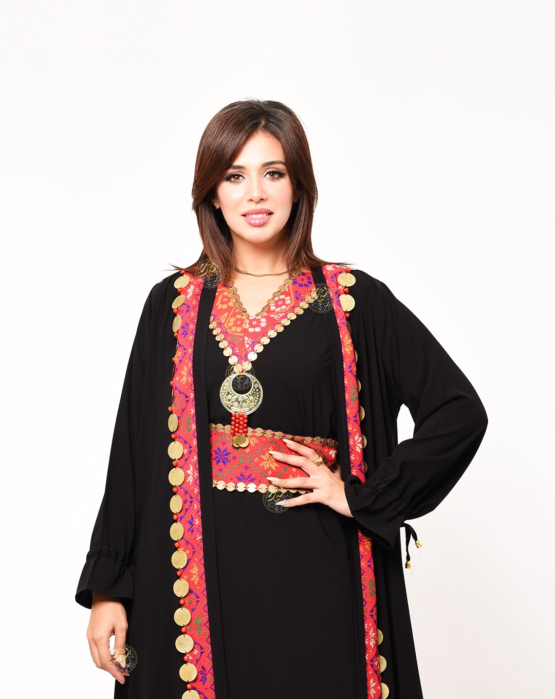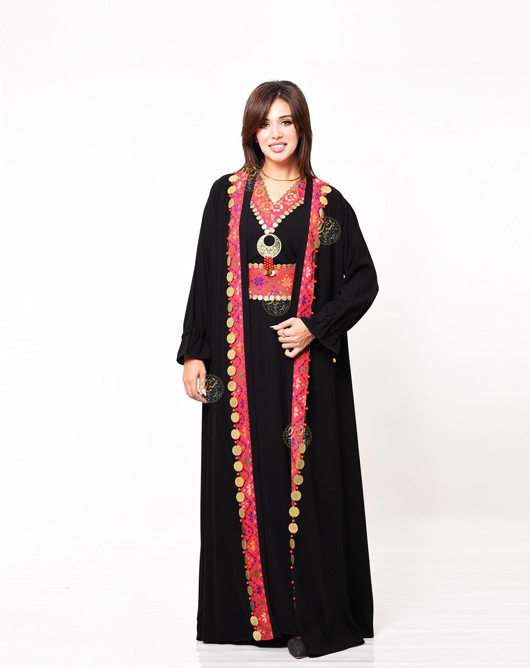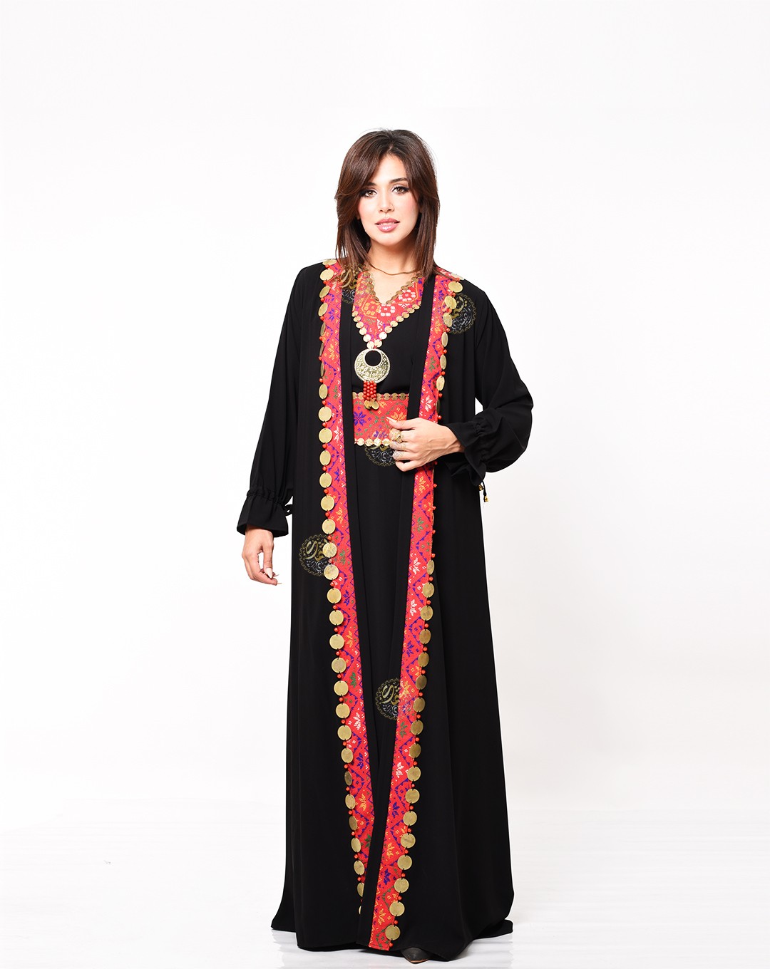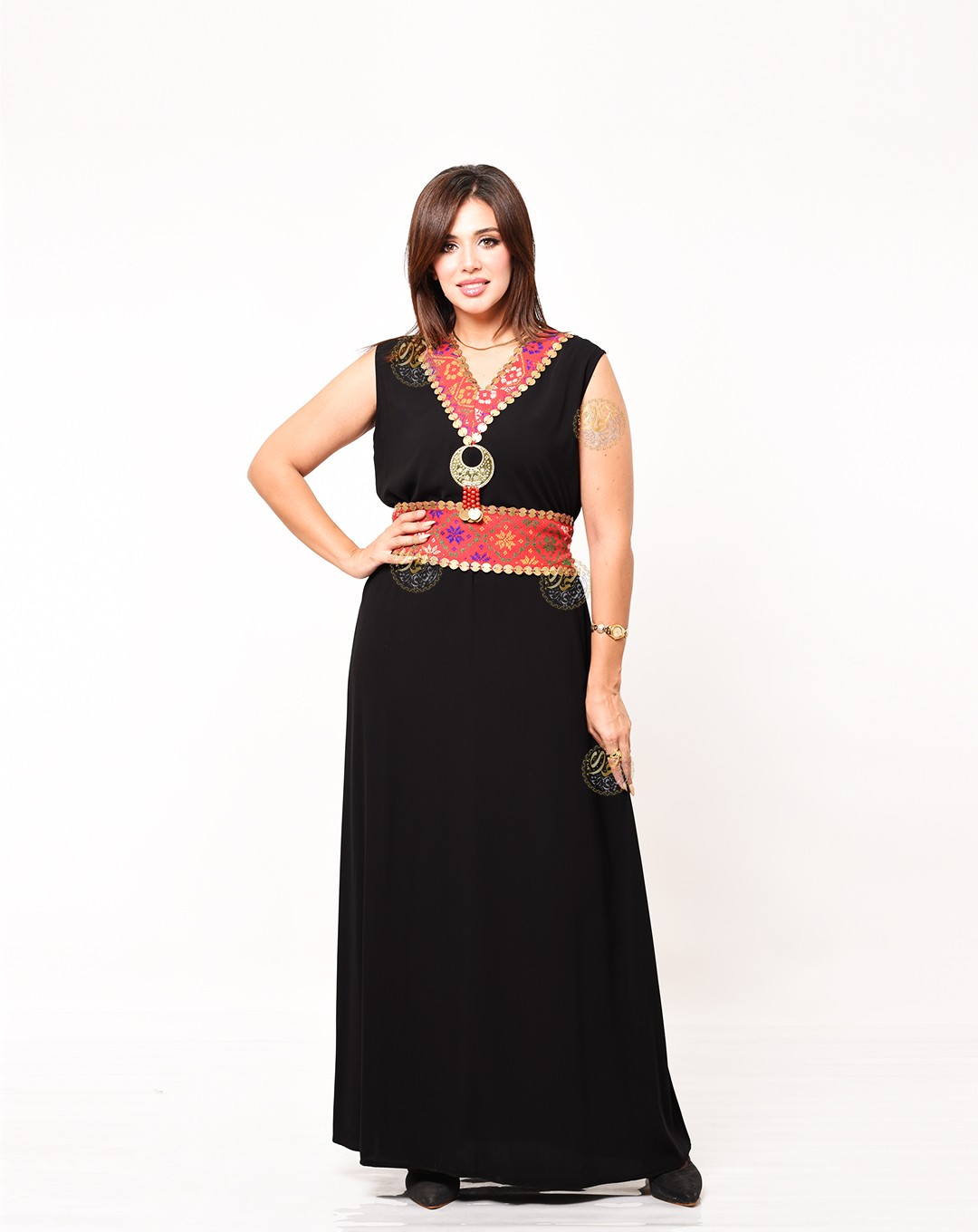 pieces (a sleeveless dress with a kaftan and belt). Made from royal crepe with