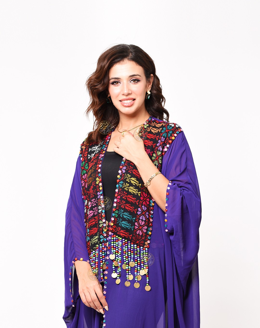 and embellished with copper coins and colorful Bedouin beads. Available in a