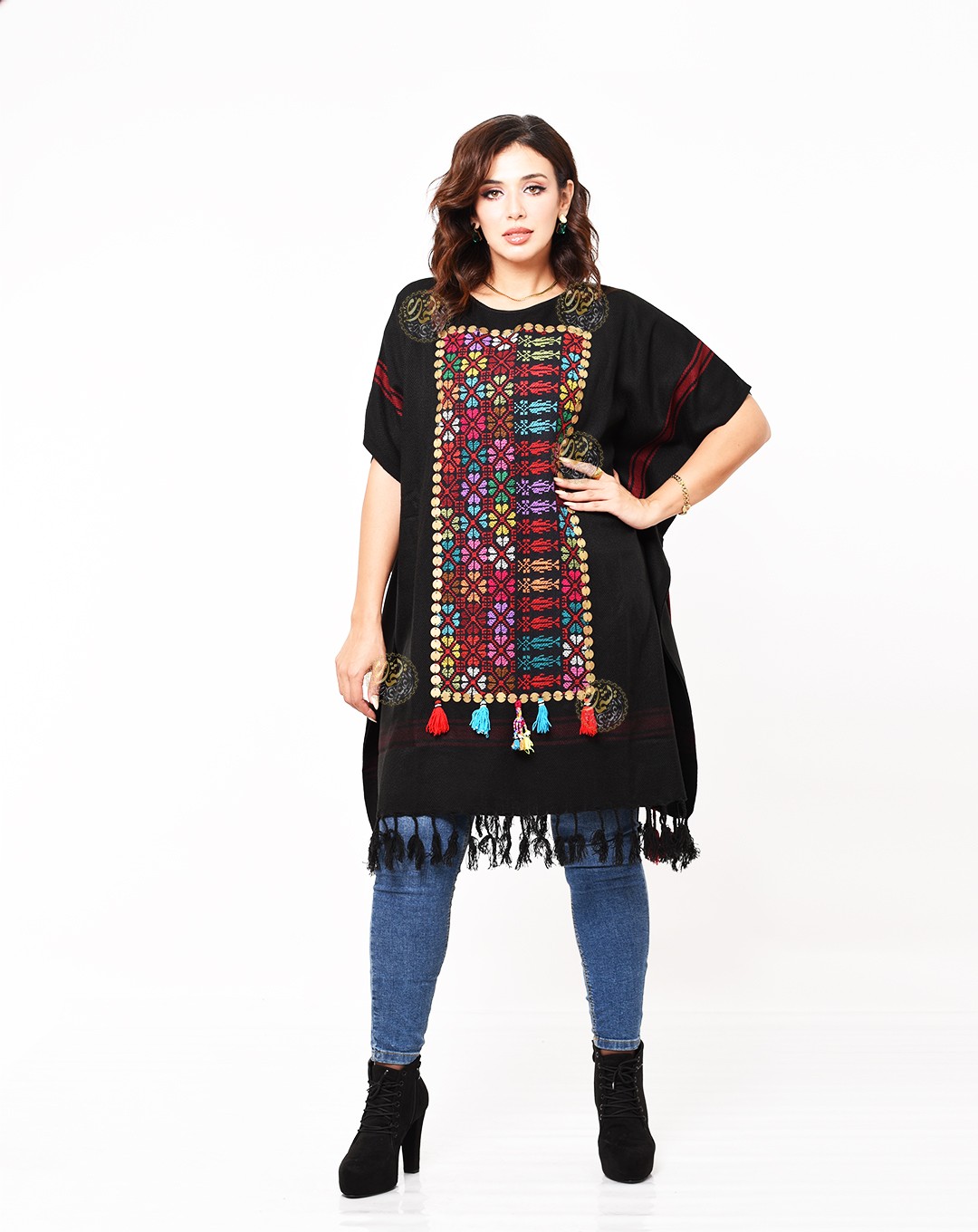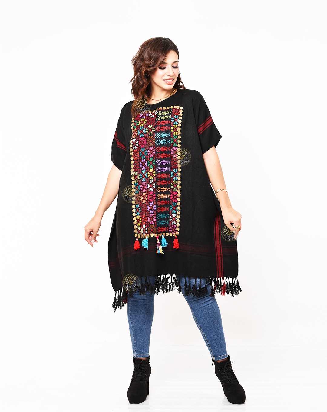 A woolen fabric shawl designed as a poncho with Gabonese sleeves, adorned with luxurious handmade Itamin details, and embroidered with colorful beads and wool fringes. It is 90 cm in length, available in a one-size fits all.
