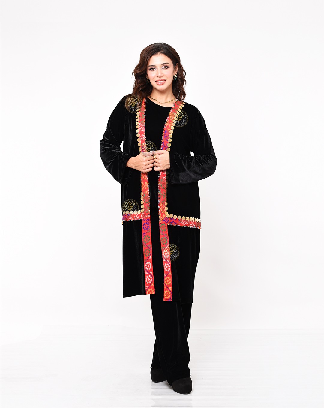 deep black Korean velvet, adorned with red handmade Itamin details and