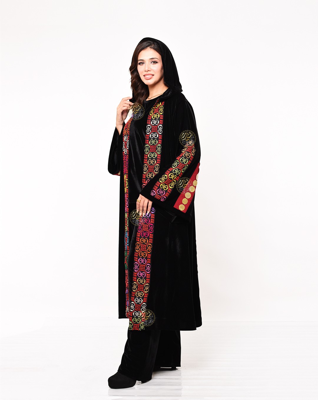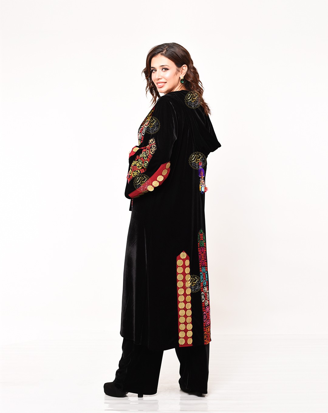 deep black Korean velvet, adorned with handmade Itamin details and embellished