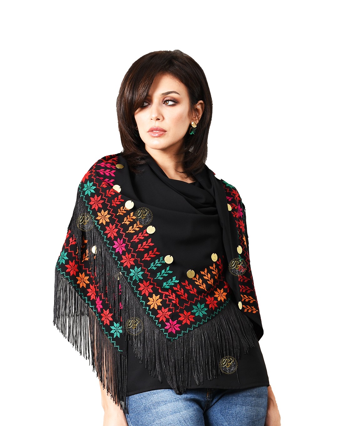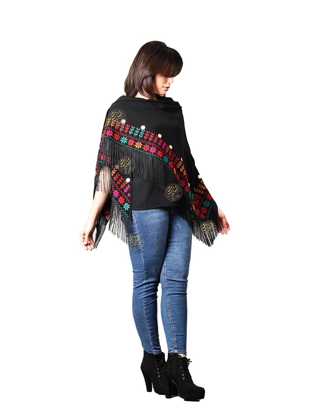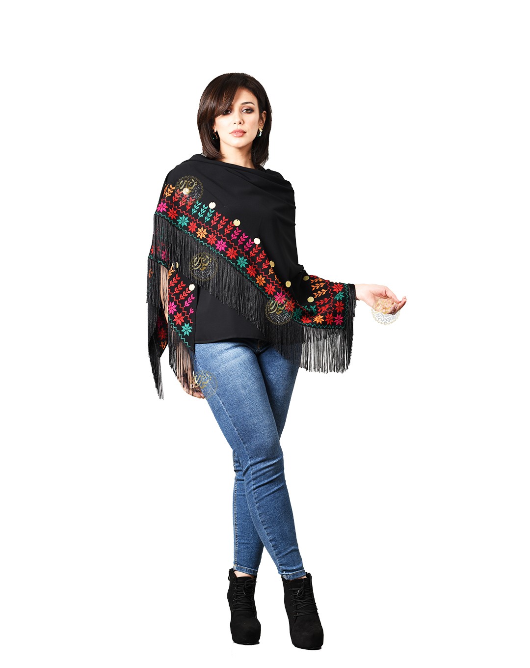 shoulder shawl made from luxurious black royal crepe fabric. It features direct